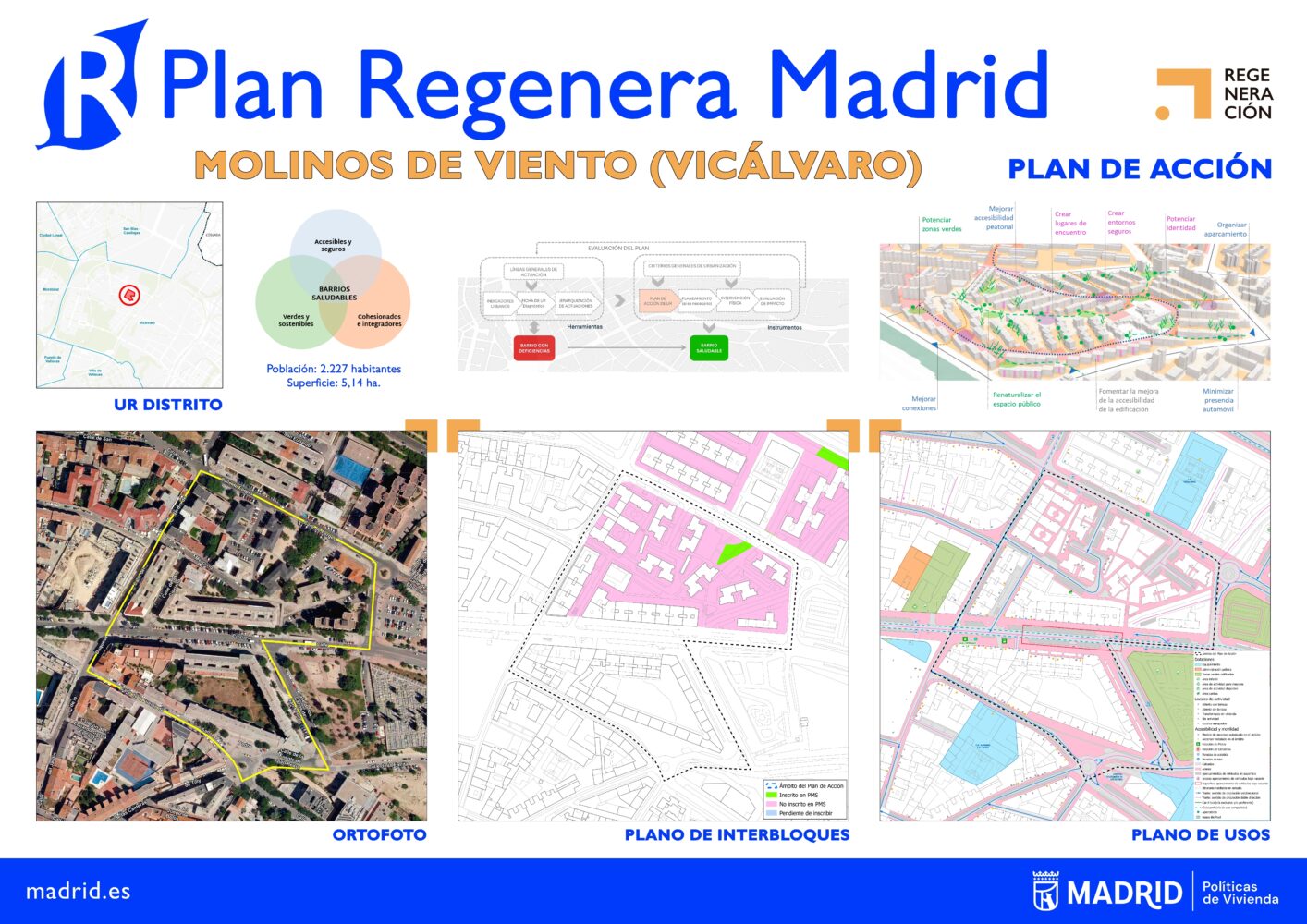 Molinos de Viento se suma a otras unidades de regeneración en las que ya se han iniciado actuaciones, siguiendo un modelo de barrio saludable que combina los ejes social, ambiental y funcional para mejorar la cohesión social, la calidad urbana y las condiciones de habitabilidad de los barrios consolidados de Madrid.