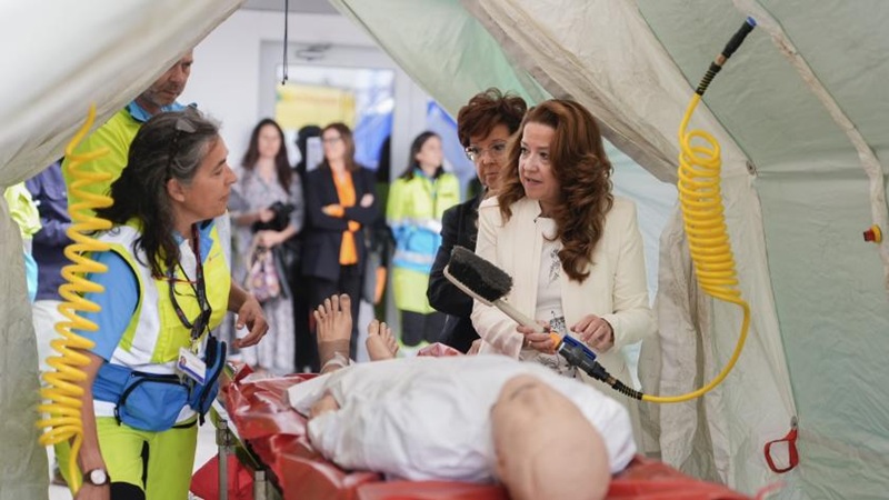 Matute ha visitado las diferentes infraestructuras y recursos que el SUMMA 112 podría desplegar ante amenazas NRBQ (nuclear, radiológico, biológico y químico), entre ellos las estaciones de descontaminación, de especial importancia en situaciones con agentes químicos o biológicos. Además, ha conocido a los profesionales que integran el Equipo Especial de NRBQ, formado por médicos, enfermeros y técnicos en emergencias sanitarias, con entrenamiento y formación especializada, junto con el material que usan para protegerse y actuar ante estas situaciones.